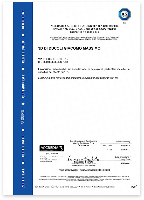 3D holds the UNI EN ISO 9001:2015 certification, valid for machining operations with chip removal on metal parts according to customer specifications.